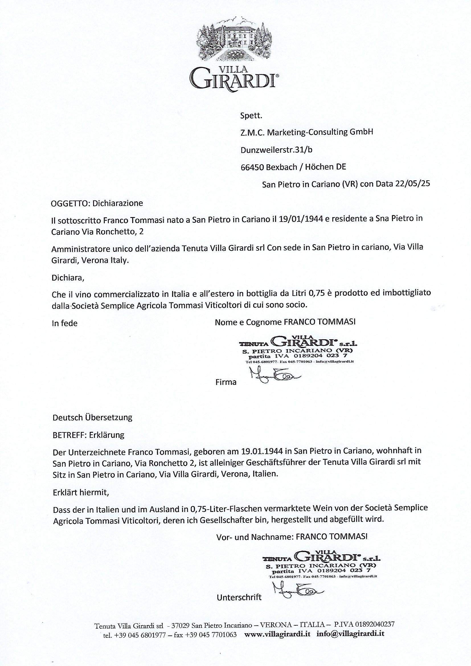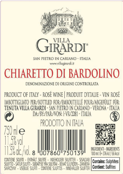 Produziert & Abgefüllt: Von Tommasi Viticoltori s. s. agricola Via Ronchetto, 4 - 37029 Pedemonte Verona Italia. Für Tenuta Villa Girardi s.r.l., Via Villa Girardi – 37029 San Pietro in Cariano Verona - Italia. Verantwortlich für die Angabe auf die Etiketten ist Tenuta Villa Girardi s.r.l. info@villagirardi.it